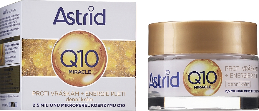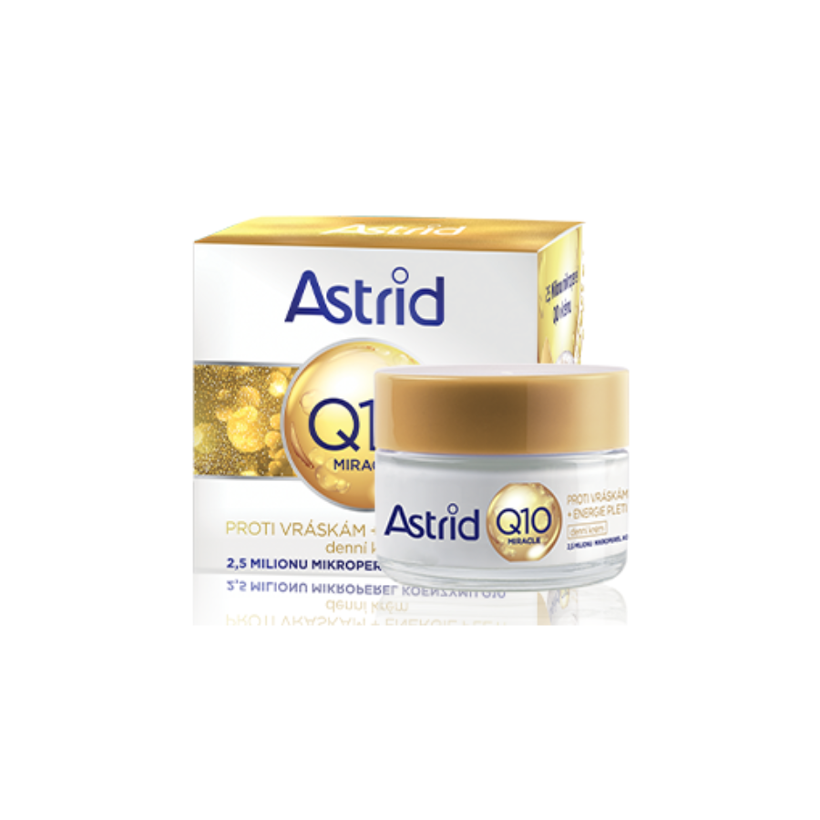 Kem dưỡng da ban ngày chống nhăn ASTRID Q10 MIRACLE với 2,5 triệu hạt coenzyme Q10 siêu nhỏ, kích thích sản sinh collagen, giúp giảm nếp nhăn, trẻ hóa làn da và duy trì vẻ ngoài tươi trẻ.